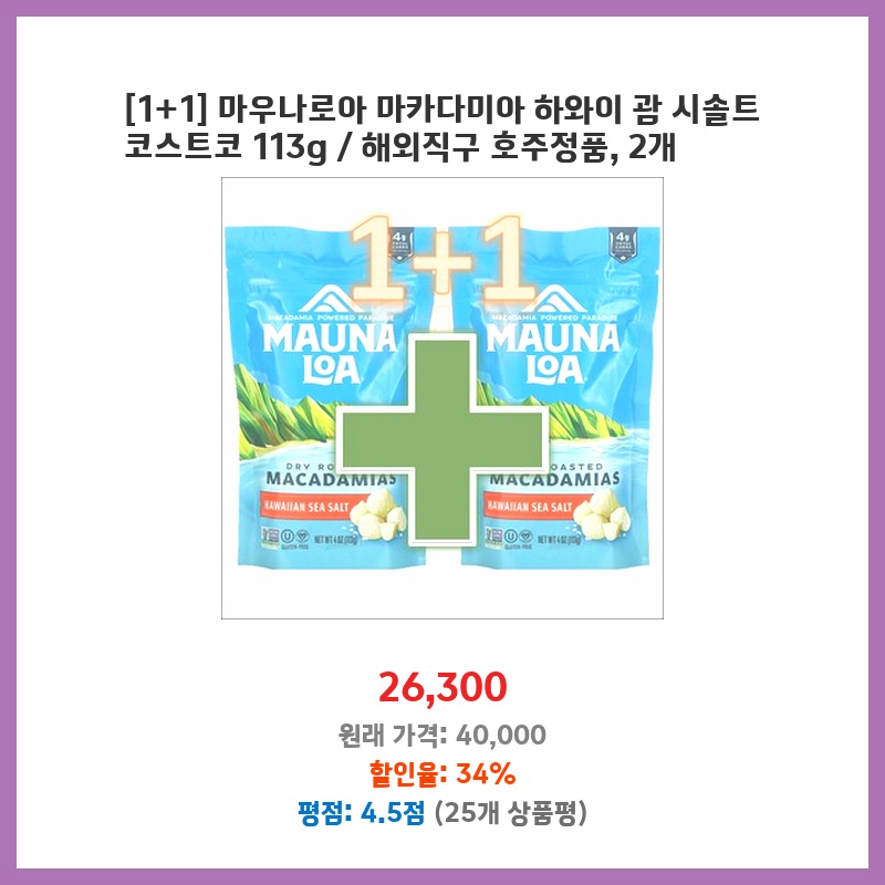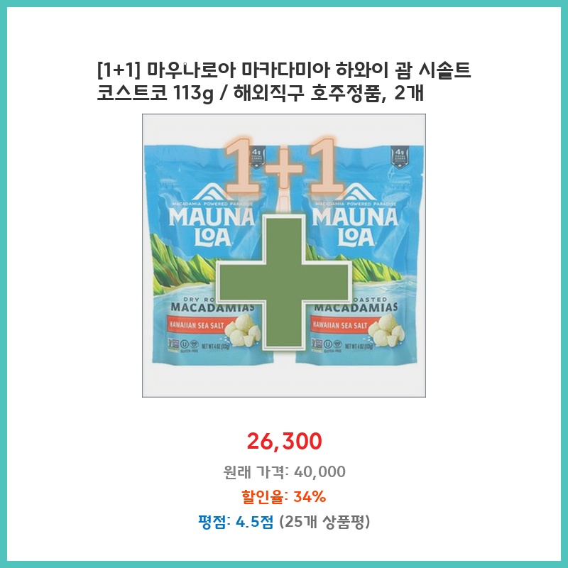[1+1] 마우나로아 마카다미아 하와이 괌 시솔트 코스트코 113g / 해외직구 호주정품, 2개