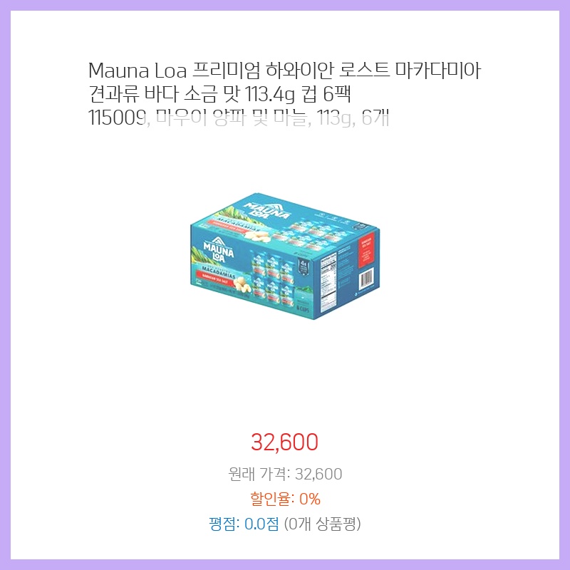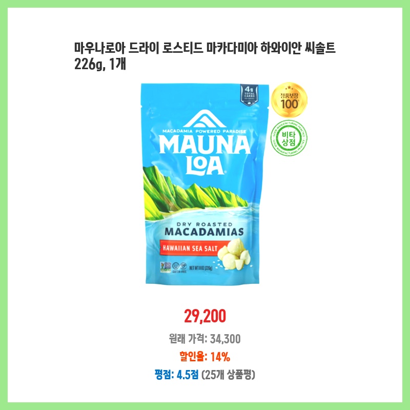 마카다미아 너트의 고유한 풍미와 하와이안 씨솔트의 섬세한 맛이 어우러진 마우나로아 마카다미아 너트를 선택했습니다. 건강한 지방과 항산화제가 풍부하여 간식이나 요리에 영양가 있는 추가 옵션이 됩니다. 맛있고 만족스러우며 건강한 선택지라는 점이 마음에 들었습니다.