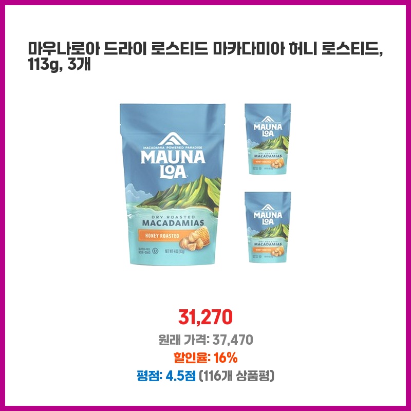 마카다미아 너트를 좋아하기 때문에 이 상품을 구매했습니다. 드라이 로스팅 처리로 바삭하고 풍부한 맛을 즐길 수 있습니다. 허니 로스팅으로 달콤한 맛이 더해져 맛있는 간식이 됩니다. 113g 포장이 3개 들어 있어 가성비도 좋습니다.