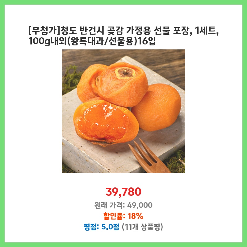 부모님 선물용으로 구매했습니다. 청도 반건시 중 왕특대과에 무첨가라 품질이 좋아 보였고, 16개입에 선물 포장까지 되어있어 따로 포장할 필요 없어 편리했습니다. 가격도 적당하다고 판단했습니다.