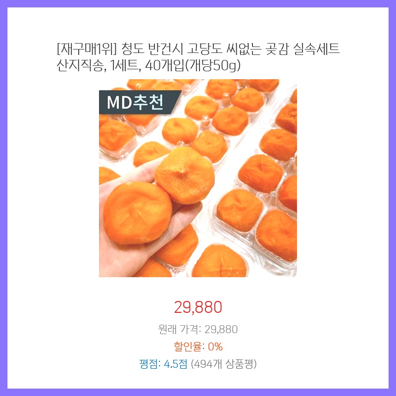부모님께 드릴 설 선물로 구매했습니다. 청도 반건시는 쫀득한 식감과 달콤한 맛이 일품이라고 들어서 선택했어요. 특50호 20개입에 선물포장까지 되어있어 가격도 적당하고 선물용으로 좋을 것 같아요.